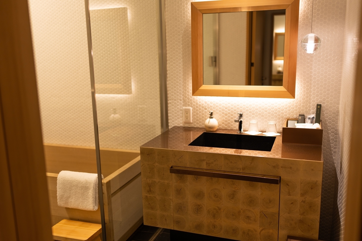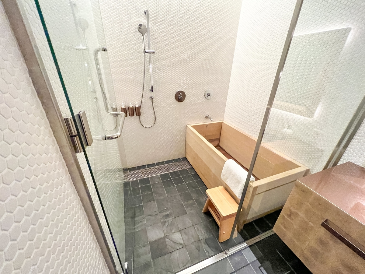 宿泊日当日は、館内をぐるりと散策した後、ヒバで できた木のお風呂にゆっくり浸かり、空間いっぱいに広がる木の香りに心も身体もリラックスすることができました。