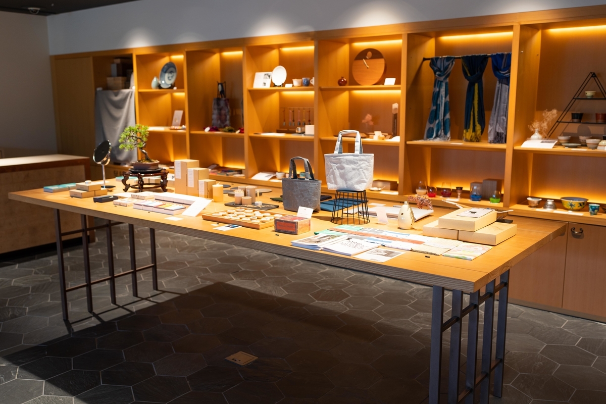 『ホテル カンラ京都』では、1階ロビー横にラウンジも併設されており、ジュースやアルコールなどの飲食を楽しみながらくつろいだり、ワークショップを見て購入したりすることもできます。